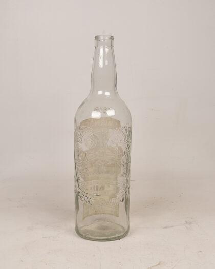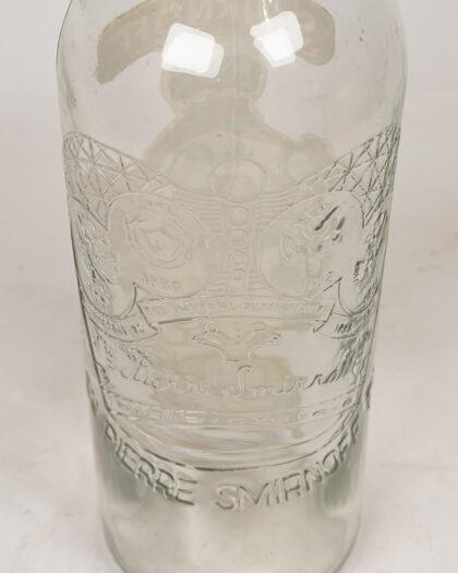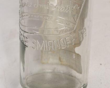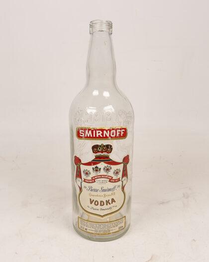 Vintage oversized Smirnoff Vodka empty glass bottle. This clear glass bottle features a prominent red and white 'Smirnoff' label with the iconic crown logo. The bottle also boasts an embossed design around the upper and lower portions, commemorating its history as 'Purveyors to the Imperial Russian Court 1886-1917'. The bottle is in good condition for its age. It is a 3 Litre bottle.