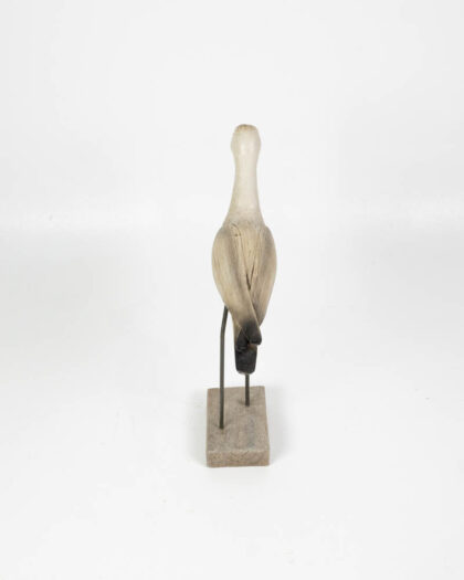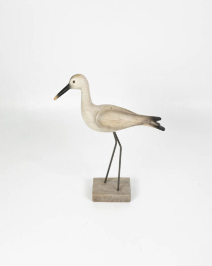 This charming sculpture depicts a wading bird, crafted from wood and featuring slender metal legs attached to a square wooden base. The bird is painted in muted tones of cream and grey, with black accents on the beak and tail. The paint has a gently distressed appearance, giving it a vintage-inspired feel. The bird's form is simple yet elegant, capturing the graceful essence of its real-life counterpart. Would look great displayed in a living room or hallway.
