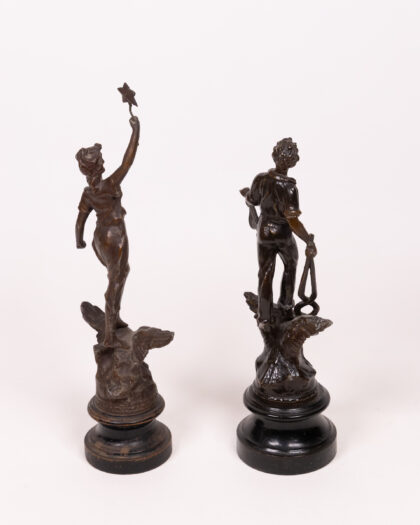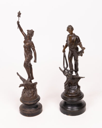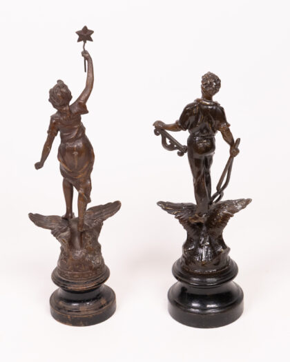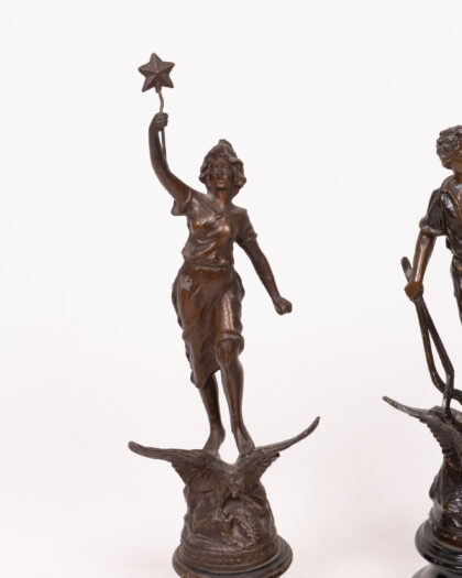 This striking pair of bronzed metal figural statues showcases classical-style figures standing atop winged eagle bases. One statue features a female figure holding a star aloft, while the other depicts a male figure with tools. Each statue rests on a turned wooden plinth, one finished in dark brown and the other in black. These detailed sculptures would make eye-catching display pieces.