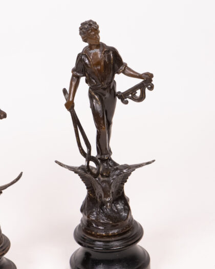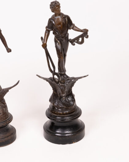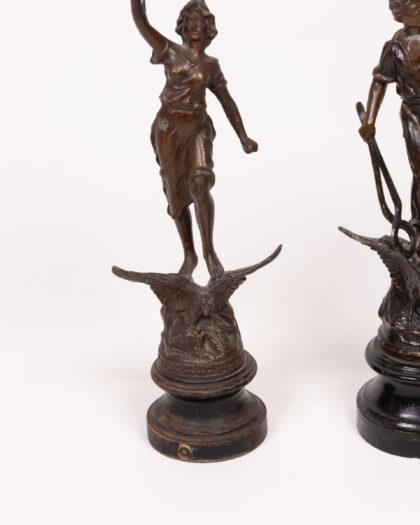 Pair of detailed bronzed metal figural statues, each standing on an eagle and wooden plinth. Classical style, striking decorative pieces.