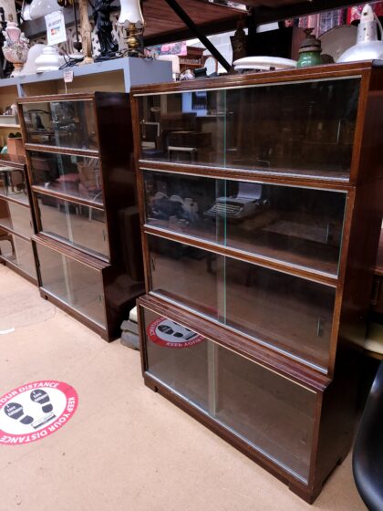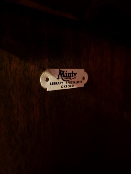 Lovely pair of dark wood 1950s glass-fronted bookcases in mint condition. Plenty of space with four shelves in each. Made by Oxford library specialists Minty Limited. This is a beautiful rare pair to take home today.