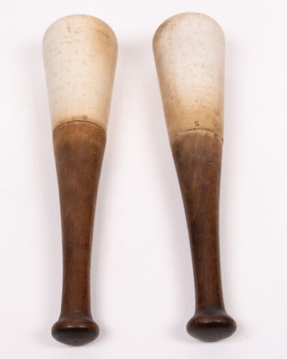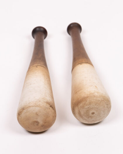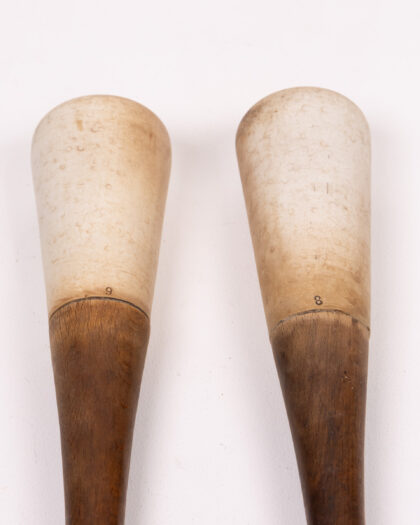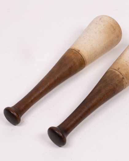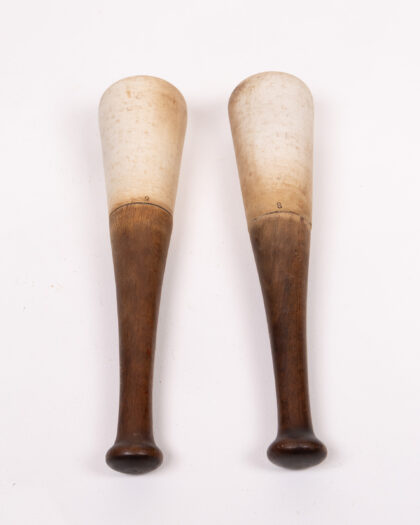 Pair of Antique French Pestals. Each maul has a rounded head and a slender handle, ending in a small knob. One is marked with the number '9' and the other with the number '8'. These items show signs of age and wear, which adds to their vintage character. They would be a good addition to a collection of sporting goods, or would be nice decorative items for a home bar or games room.