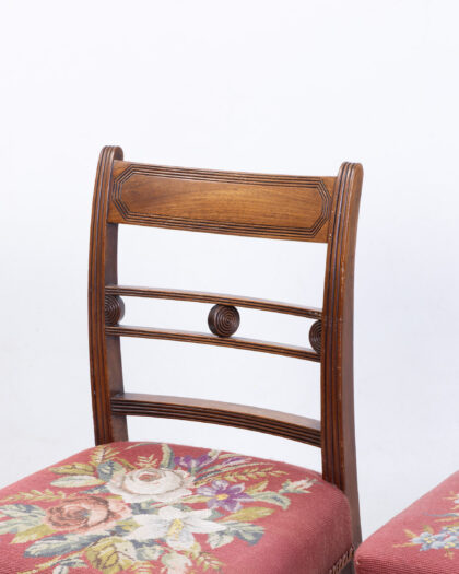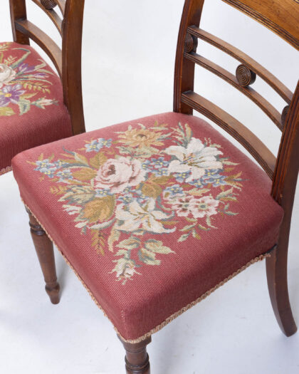 Pair of antique-style wooden dining chairs with red floral needlepoint seat cushions. Elegant and comfortable chairs for dining or occasional use.