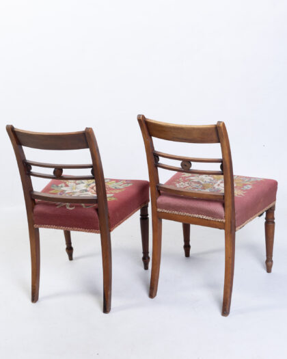 This is a charming pair of dining chairs, featuring a classic design with a comfortable touch. The frames are crafted from wood, displaying a warm brown tone and simple yet elegant detailing. The seat cushions are upholstered in a red fabric with a lovely floral needlepoint design. The chairs stand on sturdy legs. These chairs would make a wonderful addition to any dining room or living space.