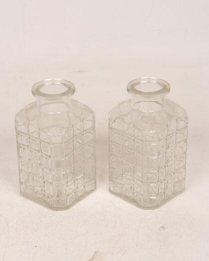 This is a set of two vintage clear glass vases. Each vase features a distinctive square grid pattern adding visual interest and a touch of vintage charm. The square shape and clear glass make them versatile for various floral arrangements or as standalone decorative pieces. Overall they appear to be in good condition, with no readily visible chips or cracks. Ideal for adding a subtle touch of vintage style to any room.