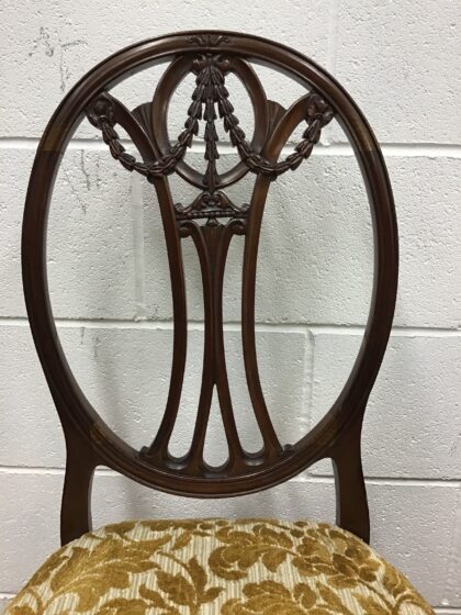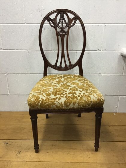 For sale we have a stunning pair of oval-backed Upholstered Edwardian Chairs. Upholstered in golden olive-green fabric. These chairs are in fabulous condition and ready for use in your home.