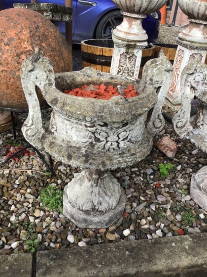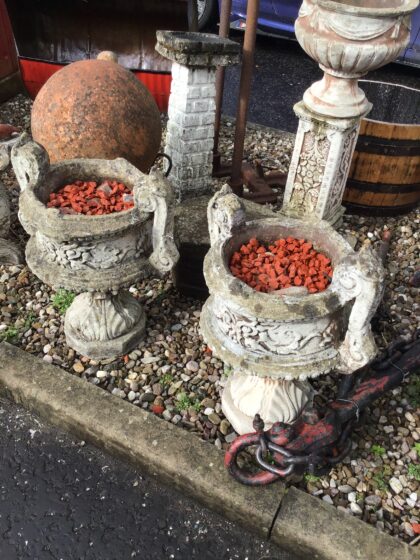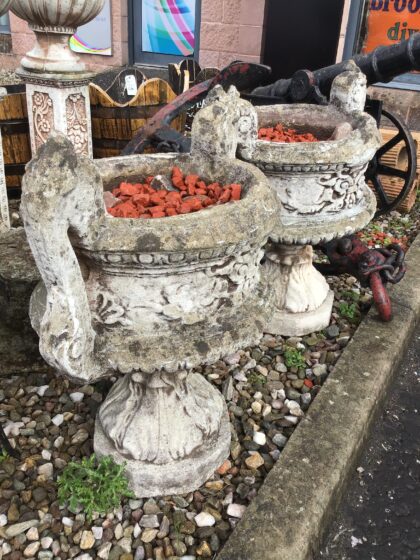 This stunning pair of handled stone garden urns have an intricate pattern. They would look great in your garden or driveway entrance.