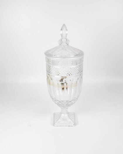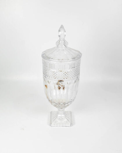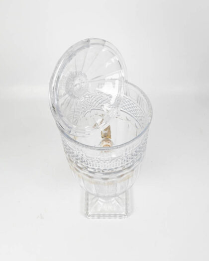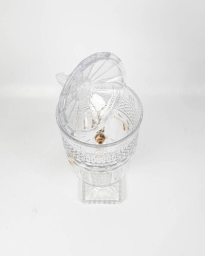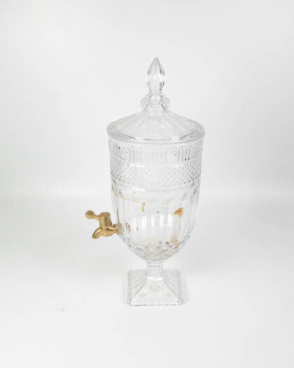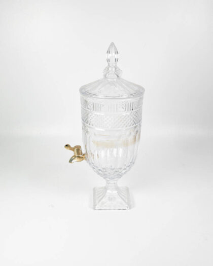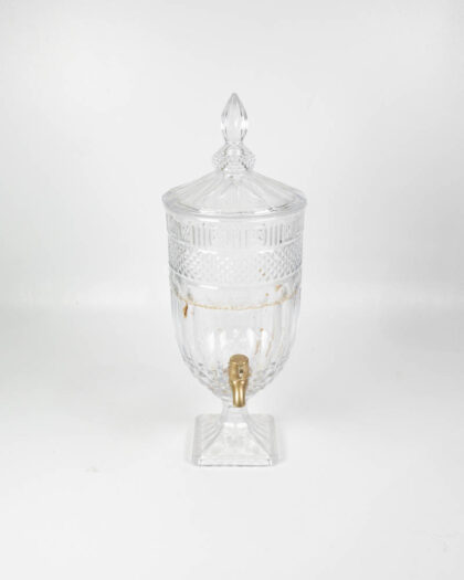 This is a pair of contemporary glass beverage dispensers, each standing on a square glass base. The glass is decorated with a diamond pattern and topped with a domed lid with a finial. Each dispenser is fitted with a brass spigot for easy serving. The dispenser can be used for serving a variety of beverages, such as water, juice, cocktails, or iced tea. These beverage dispensers are suitable for use at parties, events, or everyday use. There are minor marks from use. Otherwise, they are in good condition. These dispensers would look great on a buffet table or bar area.