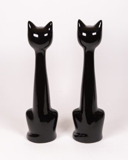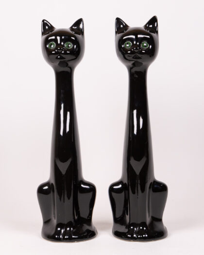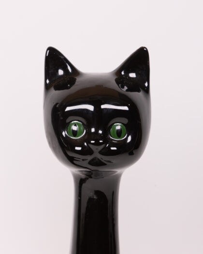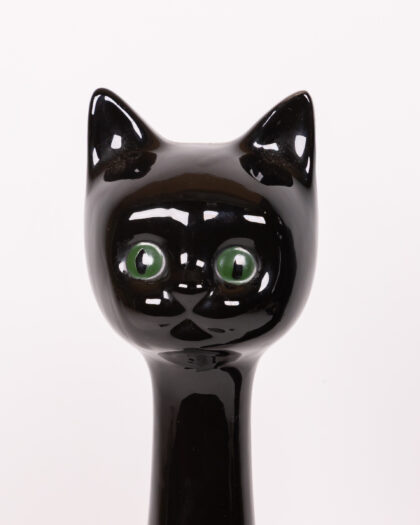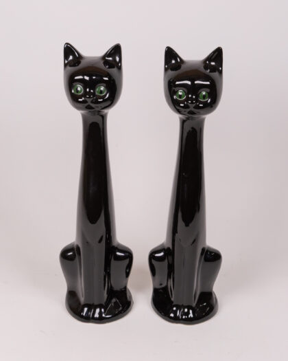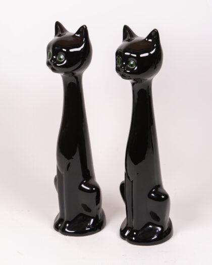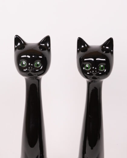 Add a captivating touch of retro charm to your home with this striking pair of vintage black cat figurines. Crafted from ceramic with a sleek, high-gloss finish, these stylised cats feature elegant, elongated necks and vibrant green eyes that beautifully catch the light. Perfect for enhancing a mantelpiece, bookshelf, or side table, these quirky figures evoke a nostalgic 1970s vibe in any room. As authentic vintage items, they possess unique character and may exhibit minor signs of wear consistent with their age, adding to their distinctive appeal.