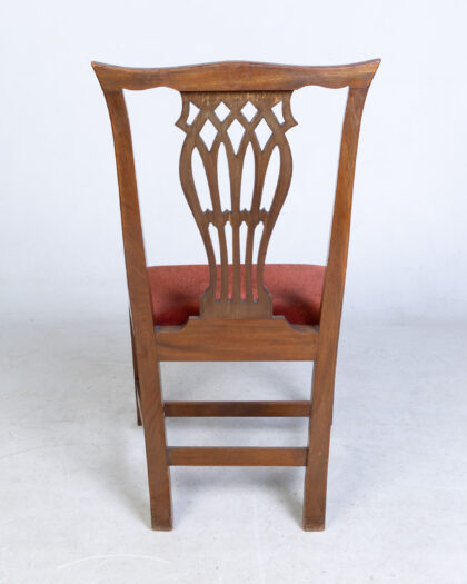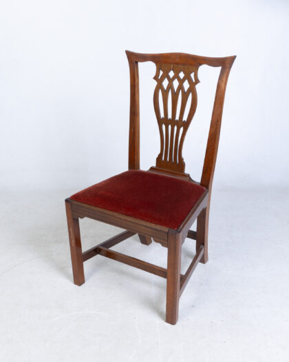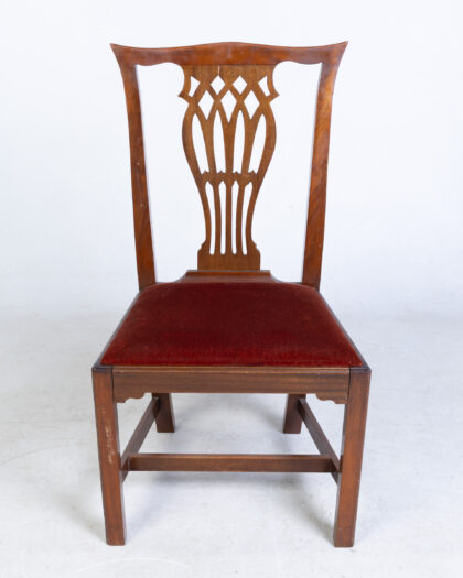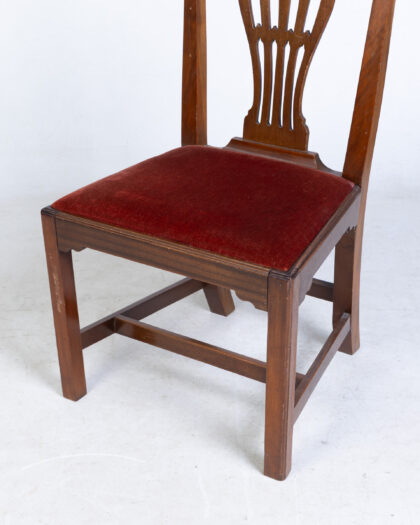 This is a pair of mahogany dining chairs in the Chippendale style, featuring red velvet seats. The chairs have a traditional design with decorative carved backs. The mahogany wood has a rich, warm tone that complements the red velvet. The condition is good overall, though there may be minor signs of wear consistent with age and use. These chairs would make an elegant addition to any dining room or seating area.