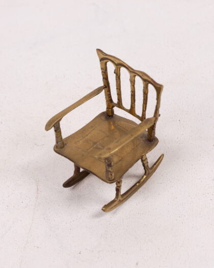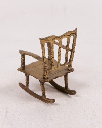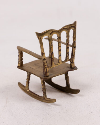 This is a set of two miniature rocking chairs made of brass. Each chair features a decorative back, armrests, and a seat with a grid pattern. The brass has a slightly aged patina, adding to their vintage charm. These tiny chairs are perfect for collectors of miniatures, dollhouse enthusiasts, or as a quirky decorative accent.
