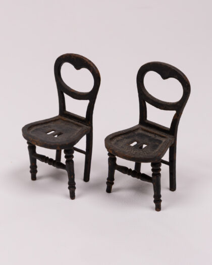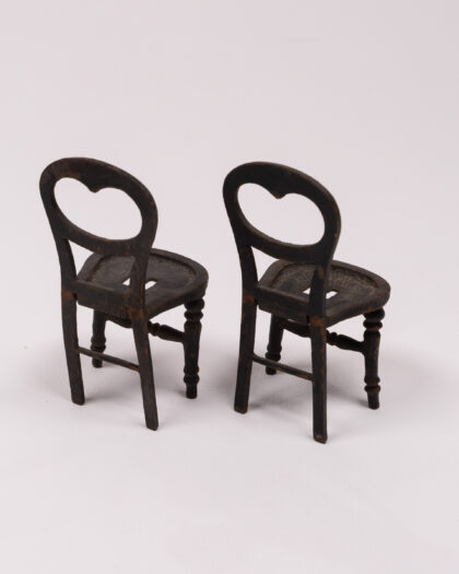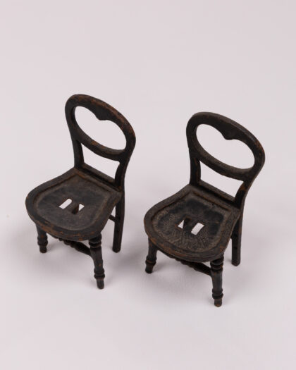 These are two miniature chairs, likely made of cast iron or a similar metal with a dark, aged finish. The chairs are of a simple design, featuring a rounded backrest with an open centre and a seat with decorative cut-outs. Each chair has four legs with rounded detailing. The dark finish gives them a vintage or antique appearance, though they could also be reproductions. The overall condition suggests they are intended as decorative items or dollhouse furniture, showing signs of age and wear. They are charming miniature pieces, perfect for collectors or as a decorative accent.