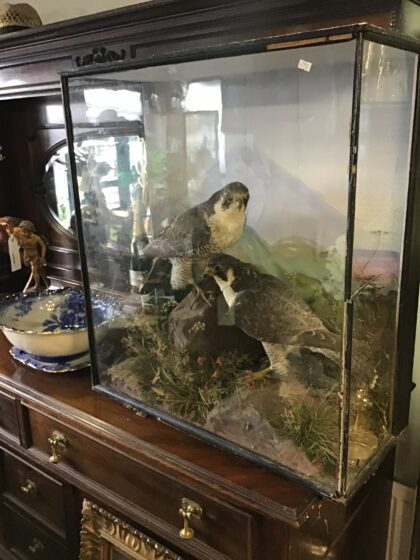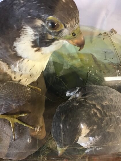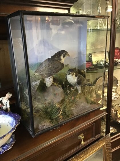 Antique taxidermy peregrine falcon pair mounted within a glazed diorama.