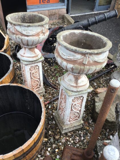 This stunning pair of stone garden urns have a decorative pattern. They would look great in your garden or driveway entrance.