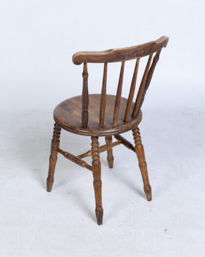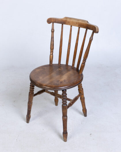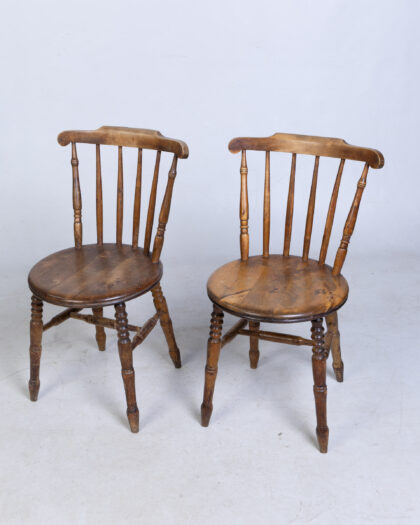 This listing is for a pair of Victorian spindle back penny chairs. The chairs are constructed from beech, featuring a light brown finish. The design includes a rounded seat, spindle backs, and turned legs. The chairs are in good vintage condition, displaying some signs of wear commensurate with age and use, adding to their character. These chairs would be ideal for adding a touch of vintage charm to any kitchen or dining space.