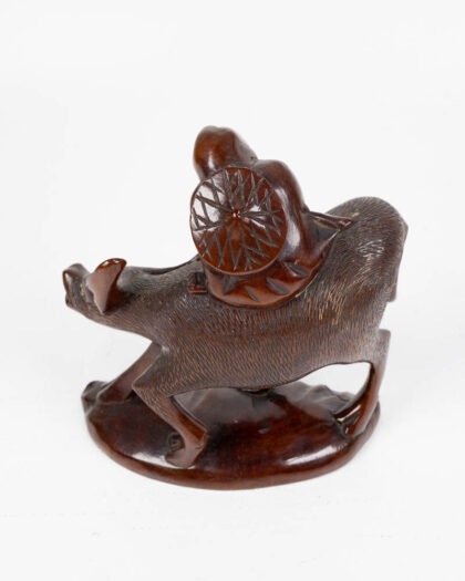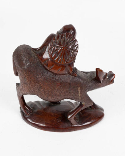 This is a pair of vintage, possibly antique, hand carved wooden figures featuring a man riding an ox. The figures are skillfully carved with fine details, showcasing the craftsmanship of the artisan. Each figure stands on an oval, leaf-like base. The wood has a rich, dark brown tone and a warm patina, indicating age and careful handling. The figures are display ready and would make an interesting addition to any shelf, mantle, or display cabinet.