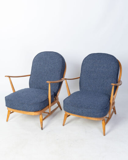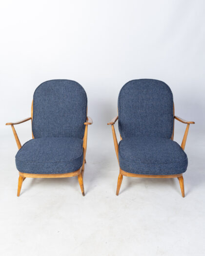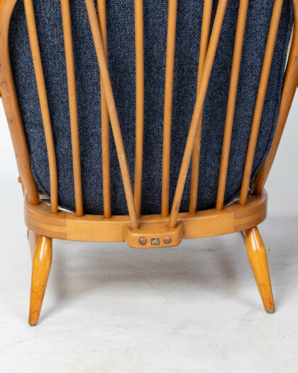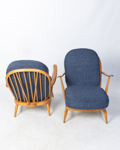 featuring the iconic Ercol design with a spindle back and comfortable armrests. The frames are made from solid wood with a light finish. The chairs have been reupholstered in a textured blue fabric, offering a contemporary touch while maintaining the original mid-century aesthetic. These chairs are in good vintage condition, showing some signs of wear consistent with age and use. Perfect for adding a touch of retro style to any living room, lounge, or reading nook. Known for their quality and comfort, Ercol chairs are a sought-after addition to any home. The Ercol badge can be seen underneath the seat.