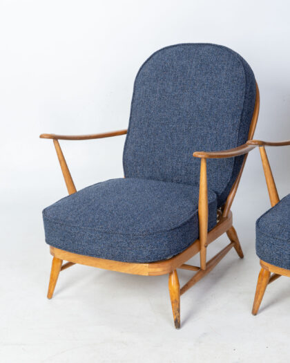 Pair of Ercol Windsor armchairs with blue fabric. Classic mid-century modern design in good condition. A stylish and comfortable addition.
