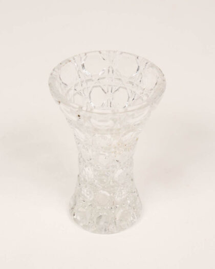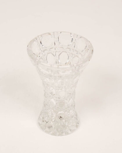 This is a pair of vintage pressed l glass vase featuring a repeating pattern. The body of the vase is decorated with raised circular shapes separated by diamond grid sections. The vase has a slightly flared rim and a pedestal base that narrows towards the middle. The clear crystal glass has a bright appearance, and the overall condition is excellent, with minimal signs of age or use. Would look lovely displayed on a mantelpiece or shelf.