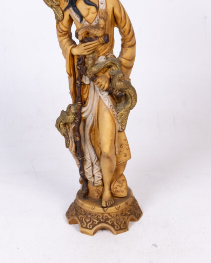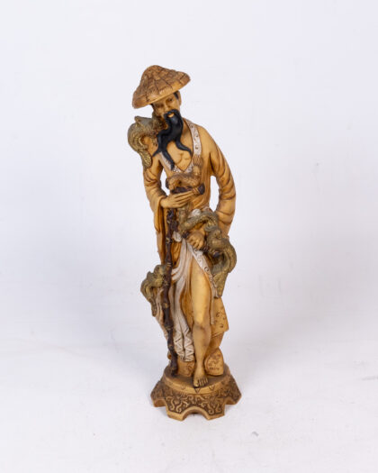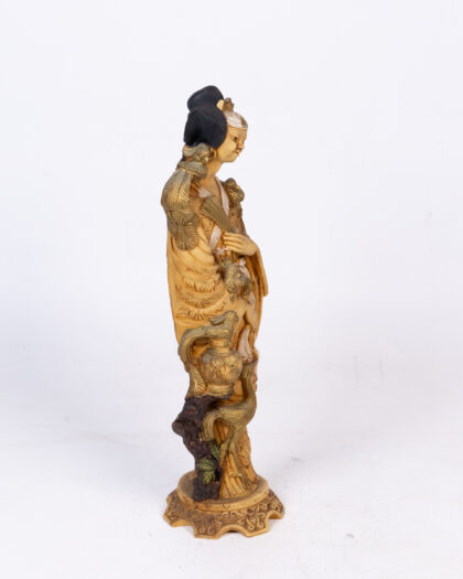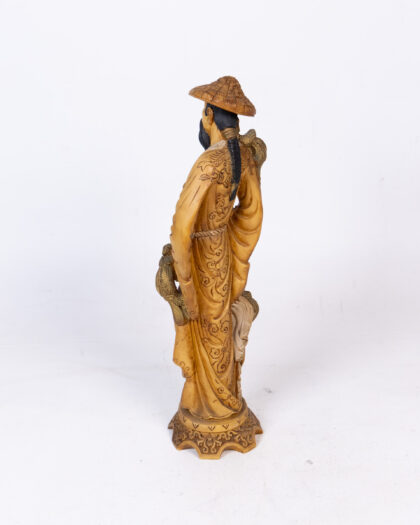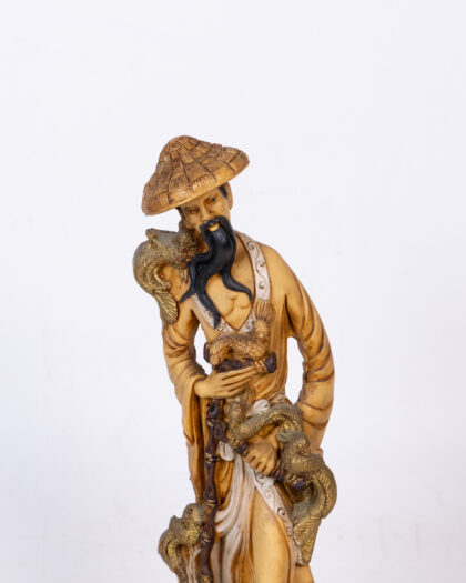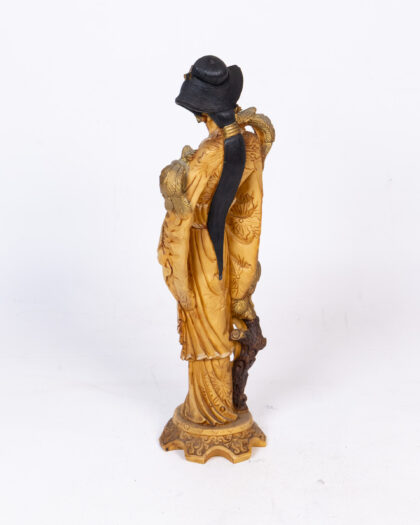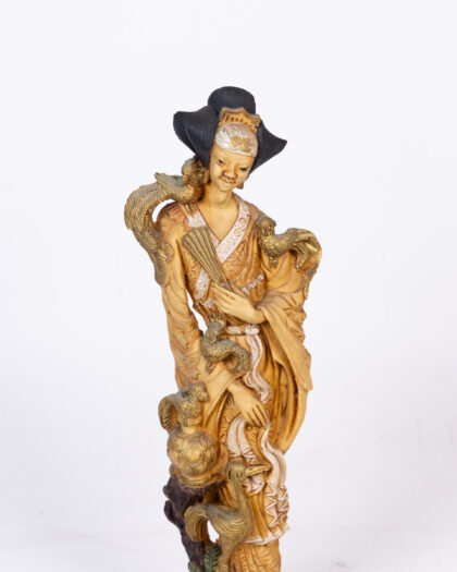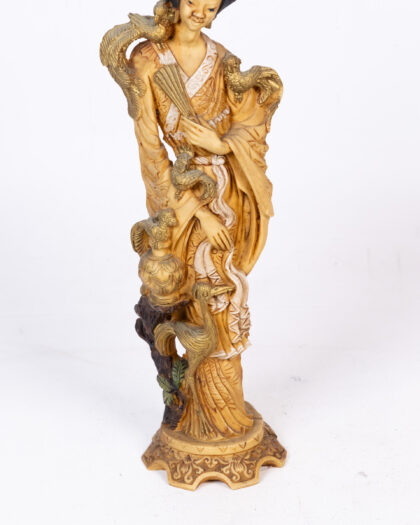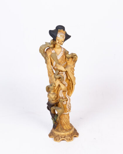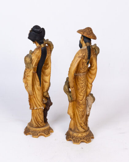 Pair of oriental resin figures, one male and one female. Both feature elaborate robes and hats and are adorned with dragons and birds. The figures are cream and gold in colour with black hair and hats. The figures are in a good state of preservation, with no visible damage.