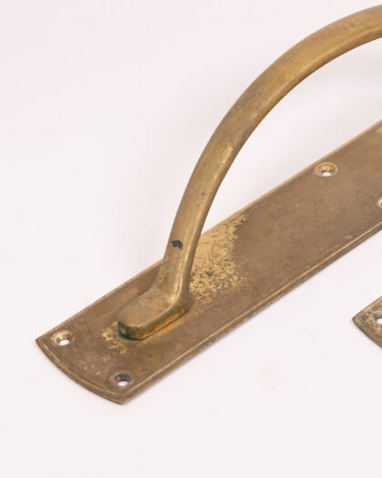 This is a matching pair of vintage-style door handles. They have a rectangular backplate, with 'PULL' inscribed at the top, with a large curved handle affixed on the face of each plate. The handles are made of brass and have a tarnished appearance, adding to the vintage aesthetic. They would make a great addition to any home.