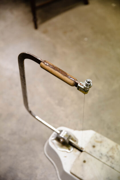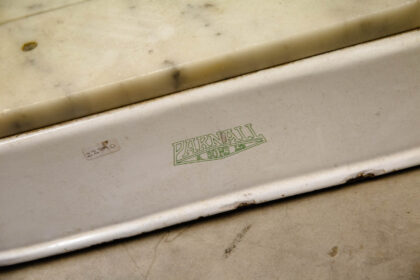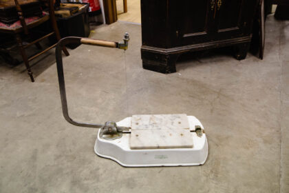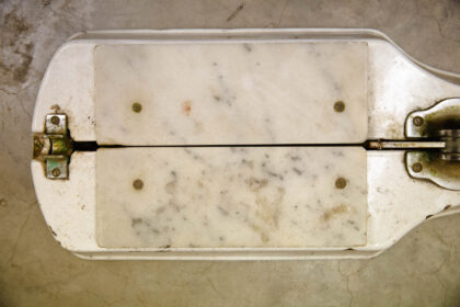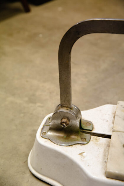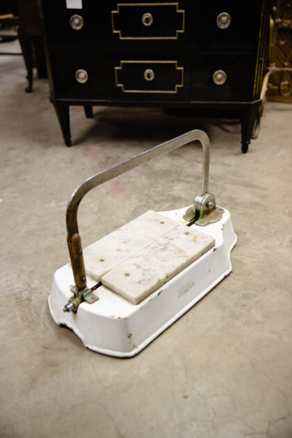 Made by Parnall & Sons Ltd. of Bristol. Heavy, white enamelled iron base with chrome cutting arm and marble cutting surface.