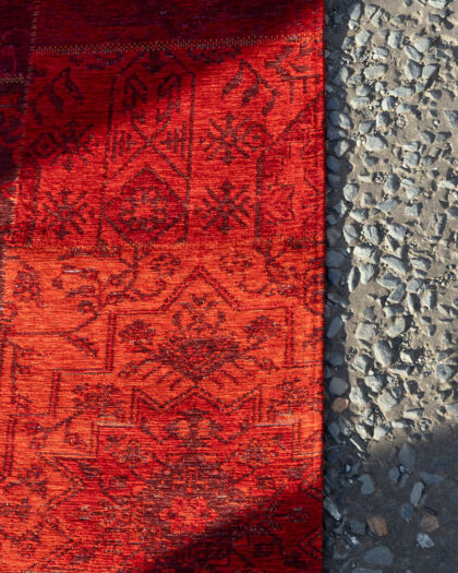 Red and brown patchwork cotton rug with various floral patterns. The rug is in good condition.