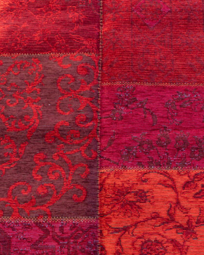 This patchwork cotton rug features a variety of red and brown fabric squares, each displaying different floral patterns. The individual squares are sewn together to create a unique and eye-catching design. The rug has a soft texture and is suitable for adding a warm touch to any room. In good condition and durable, the rug would be well-placed in a living room or bedroom space.