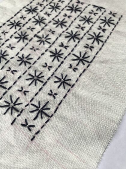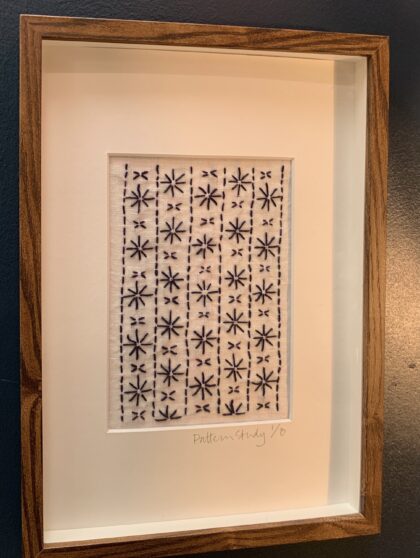 This latest body of work is essentially Bricolage in detail! – Smaller framed linen quilt samplers with geometric sashiko-stitched patterns developed from the designs from her larger quilts. This work provides an opportunity to bring a unique piece of Bricolage into your home.
