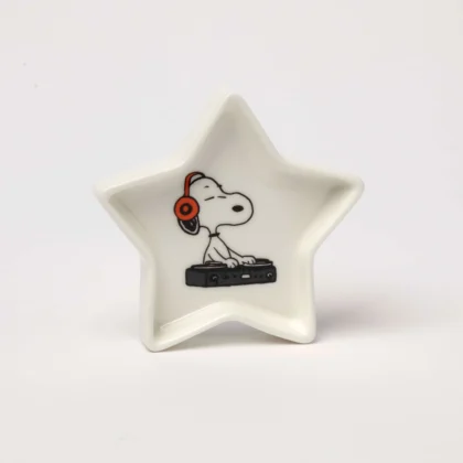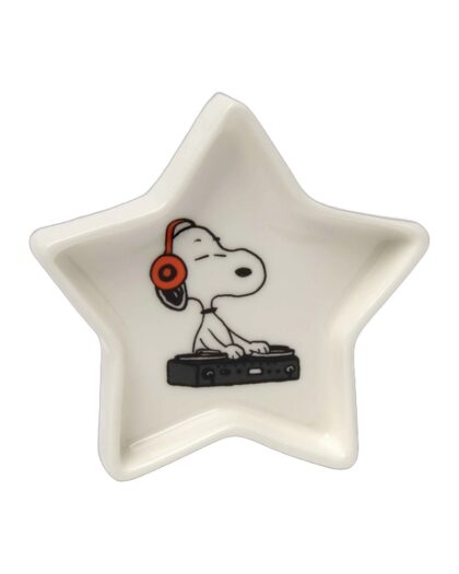 Star-shaped ceramic trinket dish featuring Peanuts' Snoopy as a Superstar DJ with orange headphones. Perfect for small items.