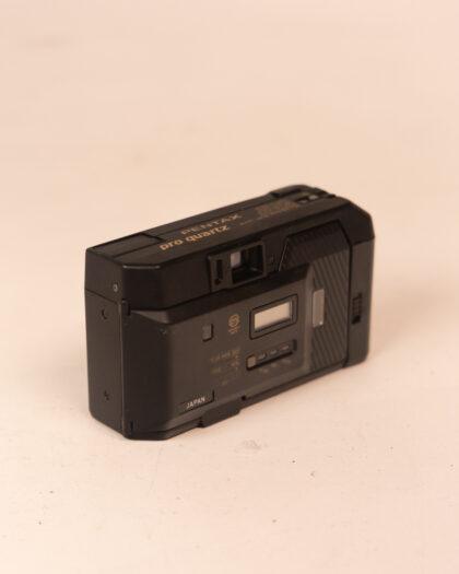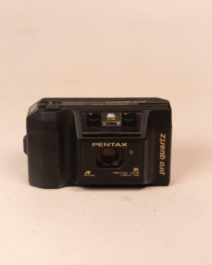 This vintage Pentax Pro Quartz camera features an autofocus system and a 35mm f/3.8 lens, making it a classic addition for any camera collector. The camera's exterior shows minor wear consistent with age. This item has not been tested, we cannot verify if it is working or not and is sold as a prop only.