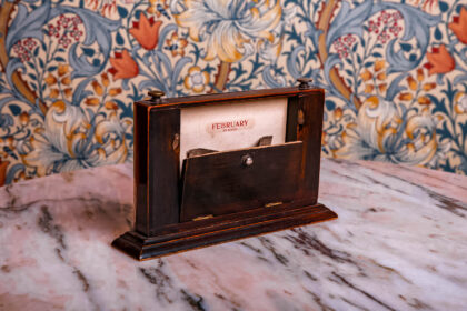 A stunning 1920s classical / art deco style perpetual desk calendar. Housed in a Sterling Silver frame which is assay stamped Birmingham 1924. The back of the frame and the pedestal are oak. A nice functioning piece that would look perfect on any modern or classic desk. Note: there is a piece of the back door missing (where the calendar is changed) but it is not noticeable from the front.