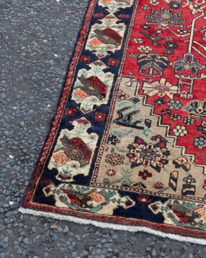 This authentic Persian rug is in very good condition and features a vibrant red background with blue and cream accents. The rug showcases an intricate floral and geometric design throughout, with a detailed border. The dimensions are 1.730m x 2.930m. The rug would make a wonderful addition to any home.
