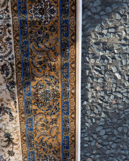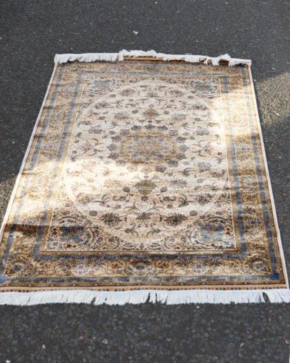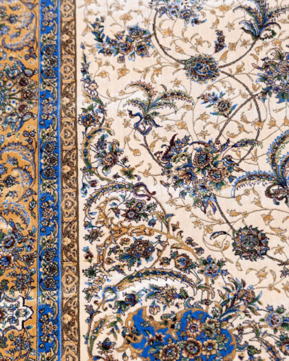 This Persian style rug features a cream field decorated with a central floral medallion in shades of gold and blue. The borders are patterned with complementary floral designs. The rug is made from silk. It is in good condition with some minor wear commensurate with age and use. This rug would be perfect in a living room or bedroom.