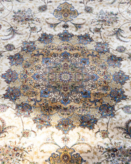 Cream wool rug with central floral medallion design and gold and blue floral patterned borders. In good condition with some minor wear.