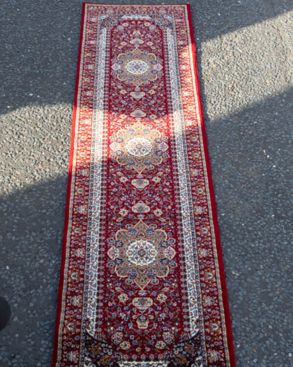 Long red runner rug with a traditional Persian style. Features intricate floral medallion design in shades of red, white, blue and gold. Good condition.