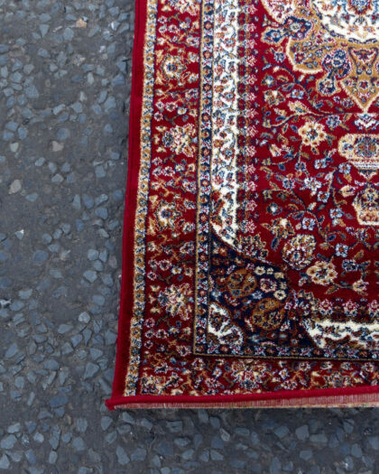 This red runner rug showcases a traditional Persian-inspired design. The long, narrow rug features an elaborate floral medallion pattern with intricate detailing. The dominant colour is a rich red, accented by white, blue, and gold floral and geometric motifs. The central pattern consists of a series of large floral medallions running the length of the rug. The rug is bordered by bands of smaller floral designs.