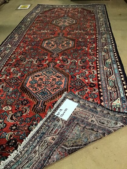 Full pile fine hand woven, Persian surok runner in washed red ground with travel medallion.