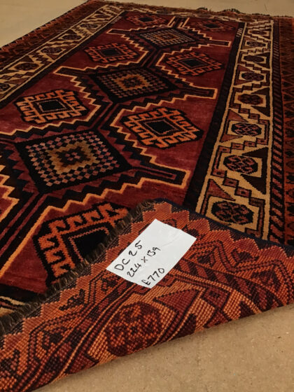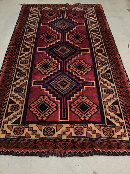Red ground Persian Kashkari tribal rug with wool fringe and medallion design in rust and burnt orange.