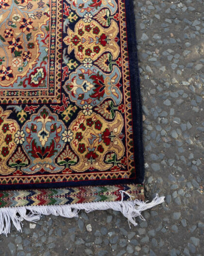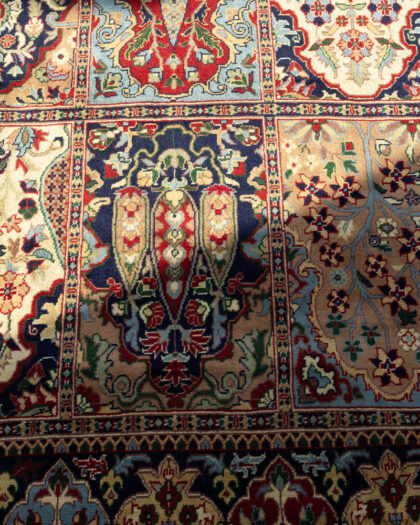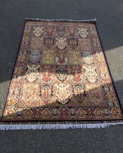 This is a hand-knotted Persian-style wool rug, showcasing a dense and intricate floral medallion design. The rug features a complex repeating pattern with a large central medallion surrounded by smaller motifs and elaborate borders. The colour palette includes deep reds, blues, creams, tans, and touches of green, all creating a rich and visually captivating effect. The rug is in very good condition. This rug would be well-suited for a living room or dining room, adding a touch of warmth and elegance to the space.