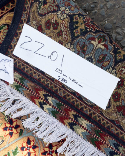 Hand-knotted wool rug featuring a intricate floral medallion design and a rich colour palette. Very good condition. Dimensions: 323cm x 200cm.