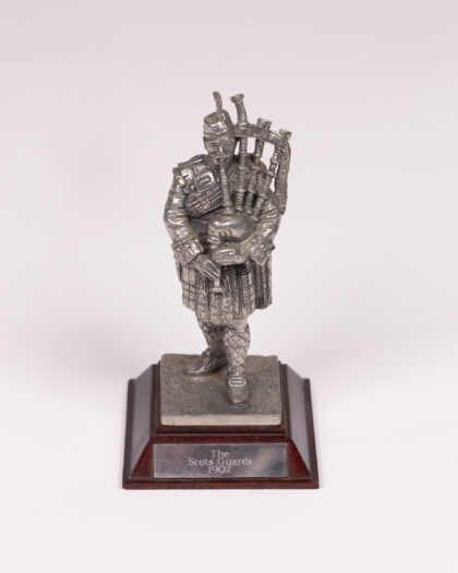 Scots Guards 1907 pewter figurine on wood base. Detailed military ornament.