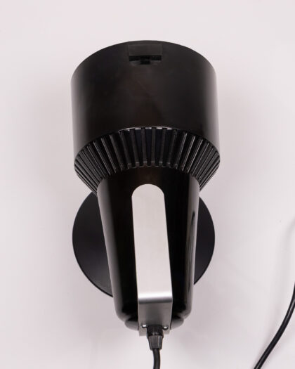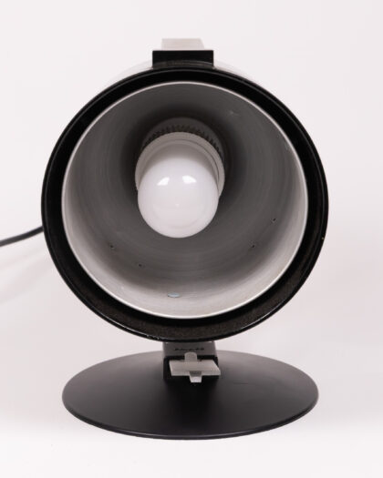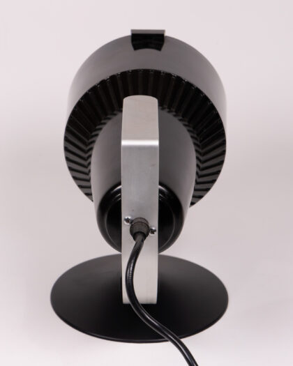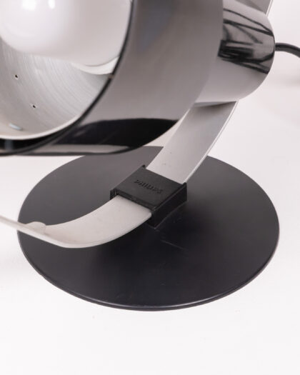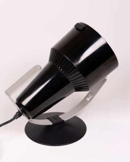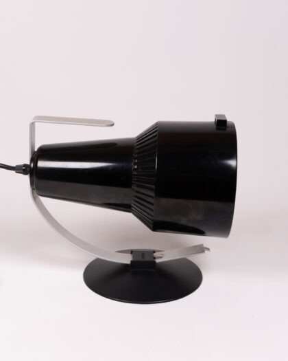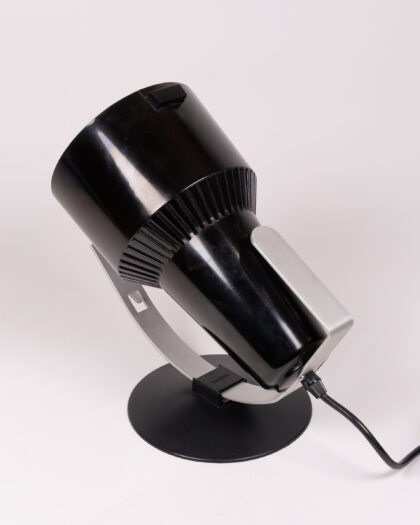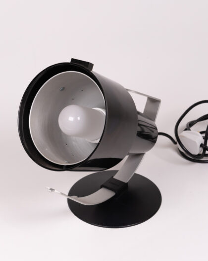 A Philips black and silver table lamp from the 1970s. This lamp has a round base and a spotlight style head. The lamp is made of plastic and metal, and has a UK plug. In great condition with a few minor scratches.