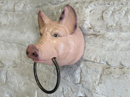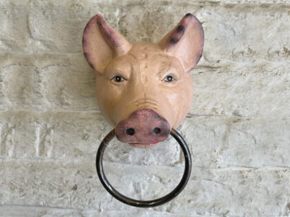 This stunning pig head doubles as an attractive and unique cast iron towel holder. The pig head is handpainted in realistic colours, which are accentuated by the intricate detailing, especially on the snout and around the eyes. A sturdy round ring hangs from his snout, capable of holding the biggest and wettest of towels! The head has a completely flush, flat back, making it easy to hang on a wall of your choosing. Perfect for homeowners who like to make a bit of a statement, this unusual and interesting towel holder is great for using in bathrooms, WCs or kitchens. A very interesting and attractive item!