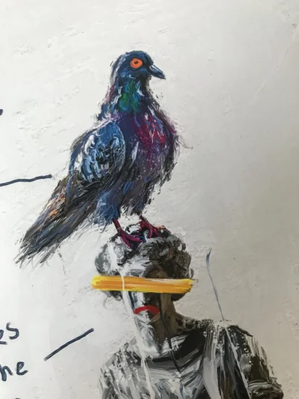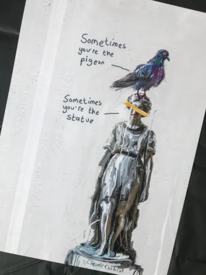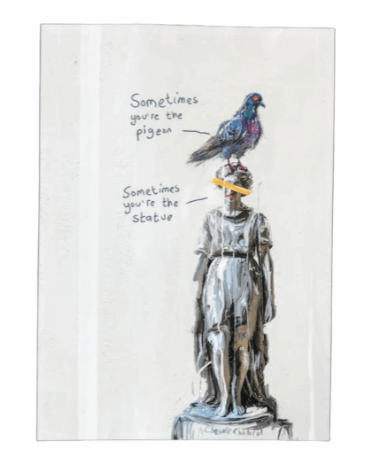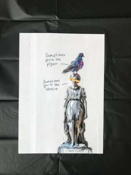 Illustration of a pigeon taking a crap on a statue, inspired by a quote about life