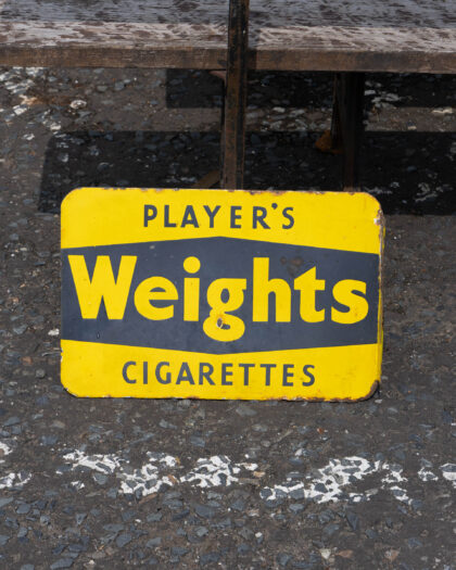Player's Weights Cigarettes double-sided enamel advertising sign. A nostalgic piece of memorabilia. Perfect for a home bar or vintage collection.
