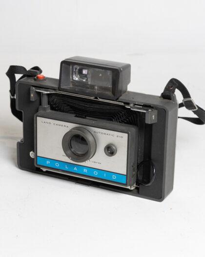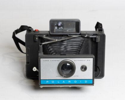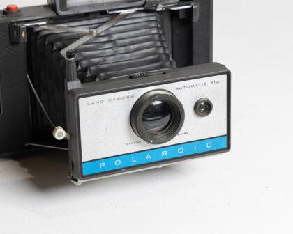 This vintage Polaroid Land Camera Automatic 210 features a classic design with bellows and a viewfinder. The camera body shows some signs of wear typical of its age. This item has not been tested, we cannot verify if it is working or not and is sold as a prop only. Perfect for collectors or as a decorative piece.