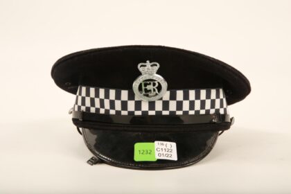 A police constable hat with applied Northumbria Police plate
