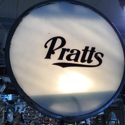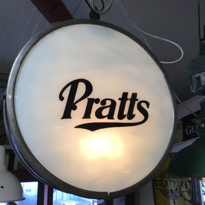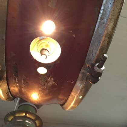 Probably off the top of an oil dispenser, this old lamp illuminates on both sides within the housing.