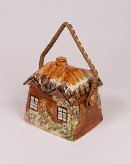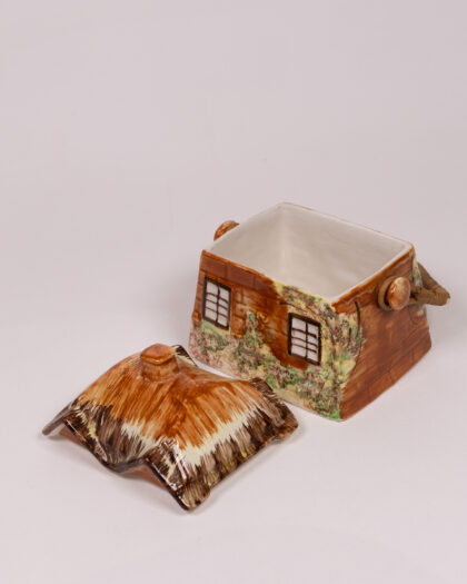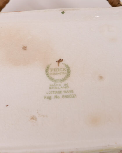 This is a 'Price Kensington Cottage Ware' trinket box. It's shaped like a thatched cottage with a handle made of a natural woven material. The box is primarily brown and white, with green floral details on the walls. The lid has a thatch-style design, and the base of the item says "Price Kensington," "Made in England", "Cottage Ware", and "Reg. No. 845007". The interior is plain white. Overall this piece is in good condition but is a vintage item so shows signs of wear.